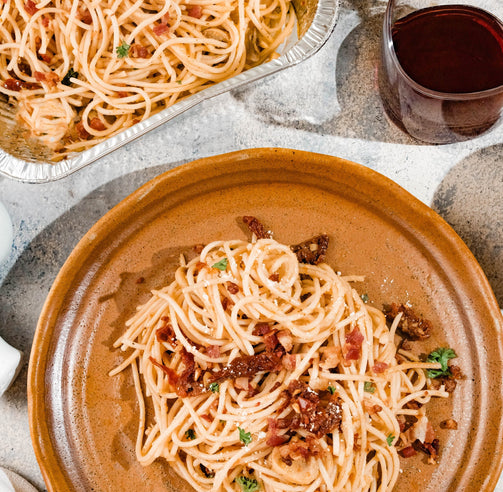 Olive oil based pasta with bacon, sundried tomato and a kick of spice